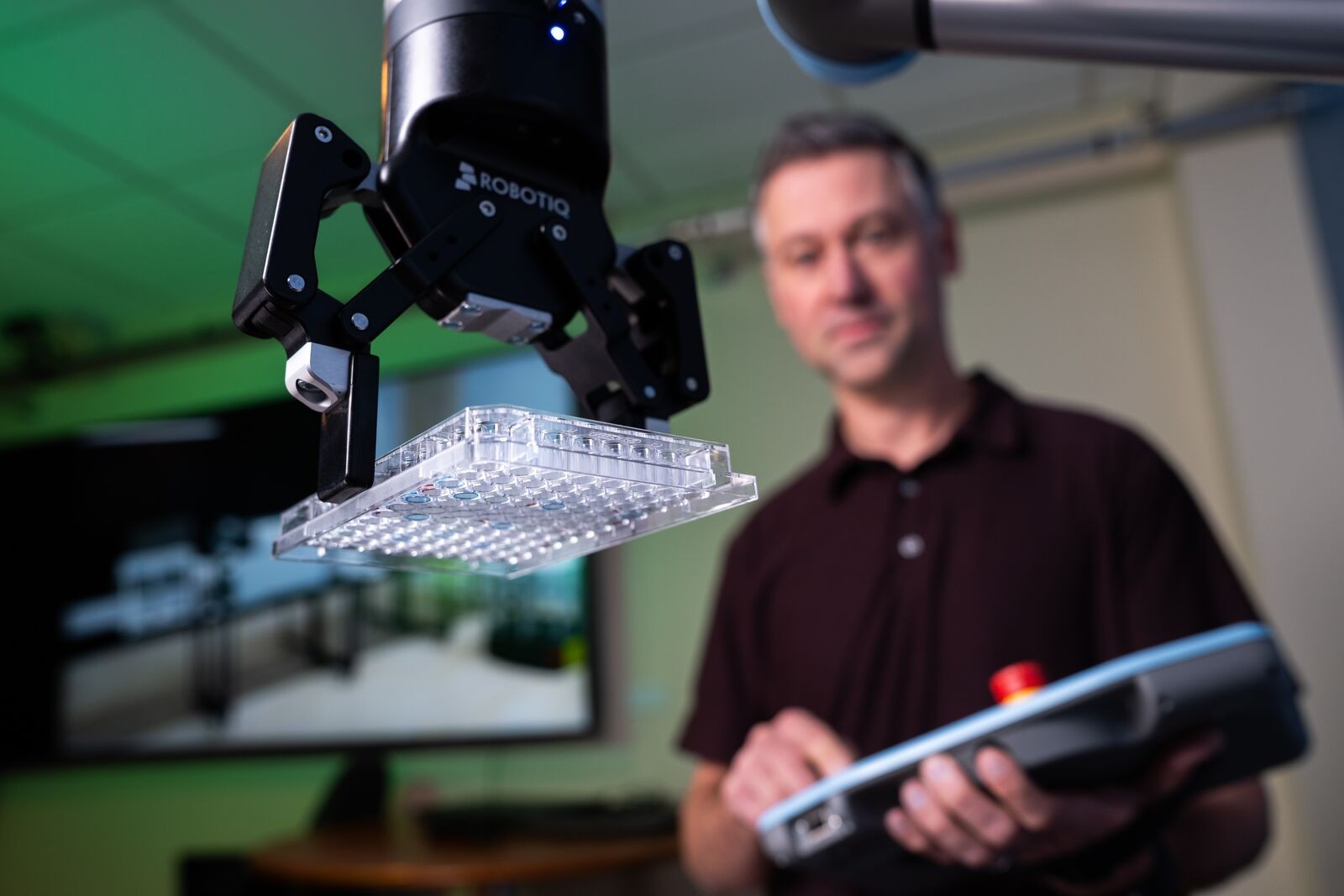 A researcher with a control device standing behind a robotic arm holding a lab sample tray.