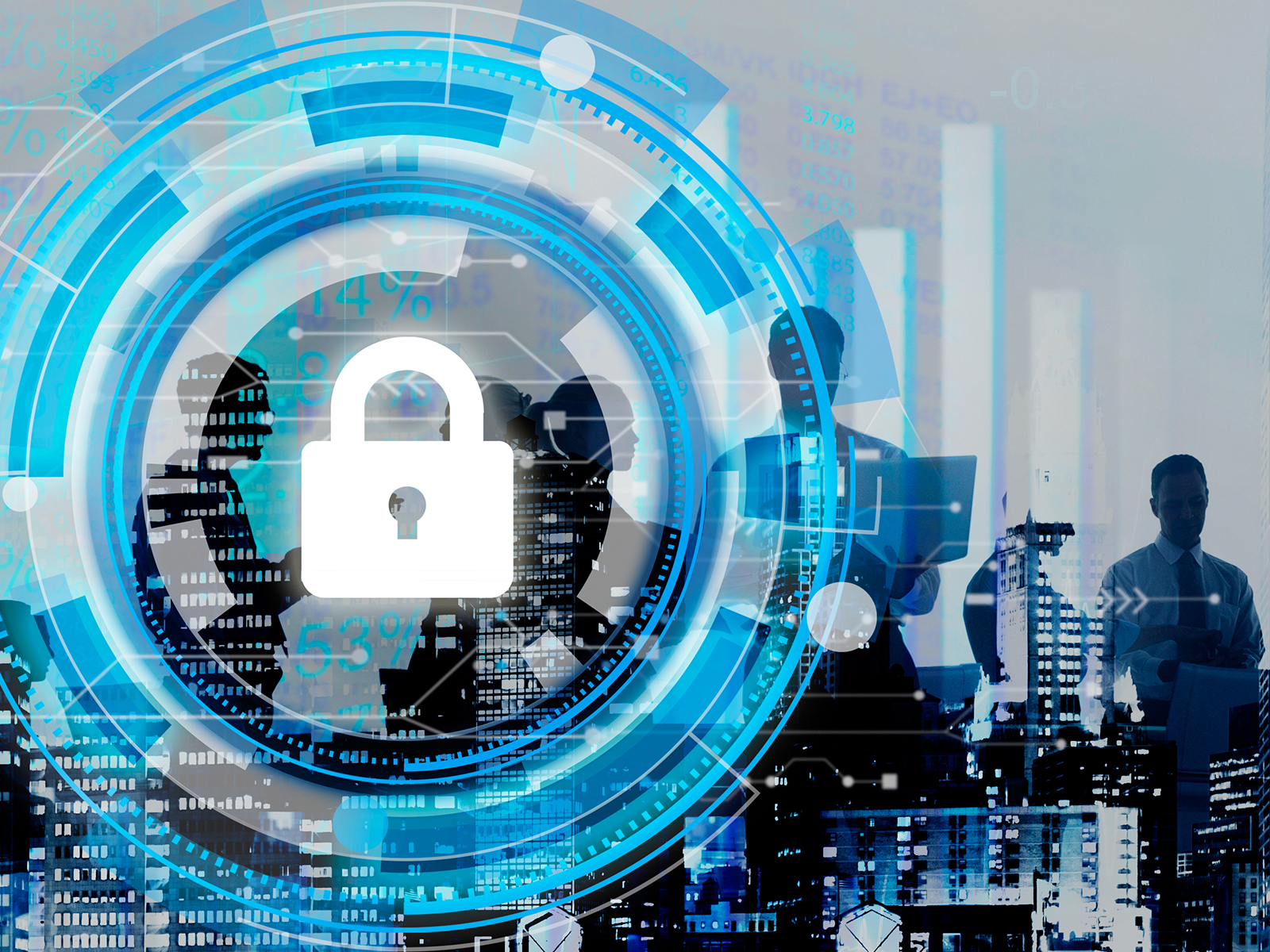padlock graphic over abstract cyber and building images