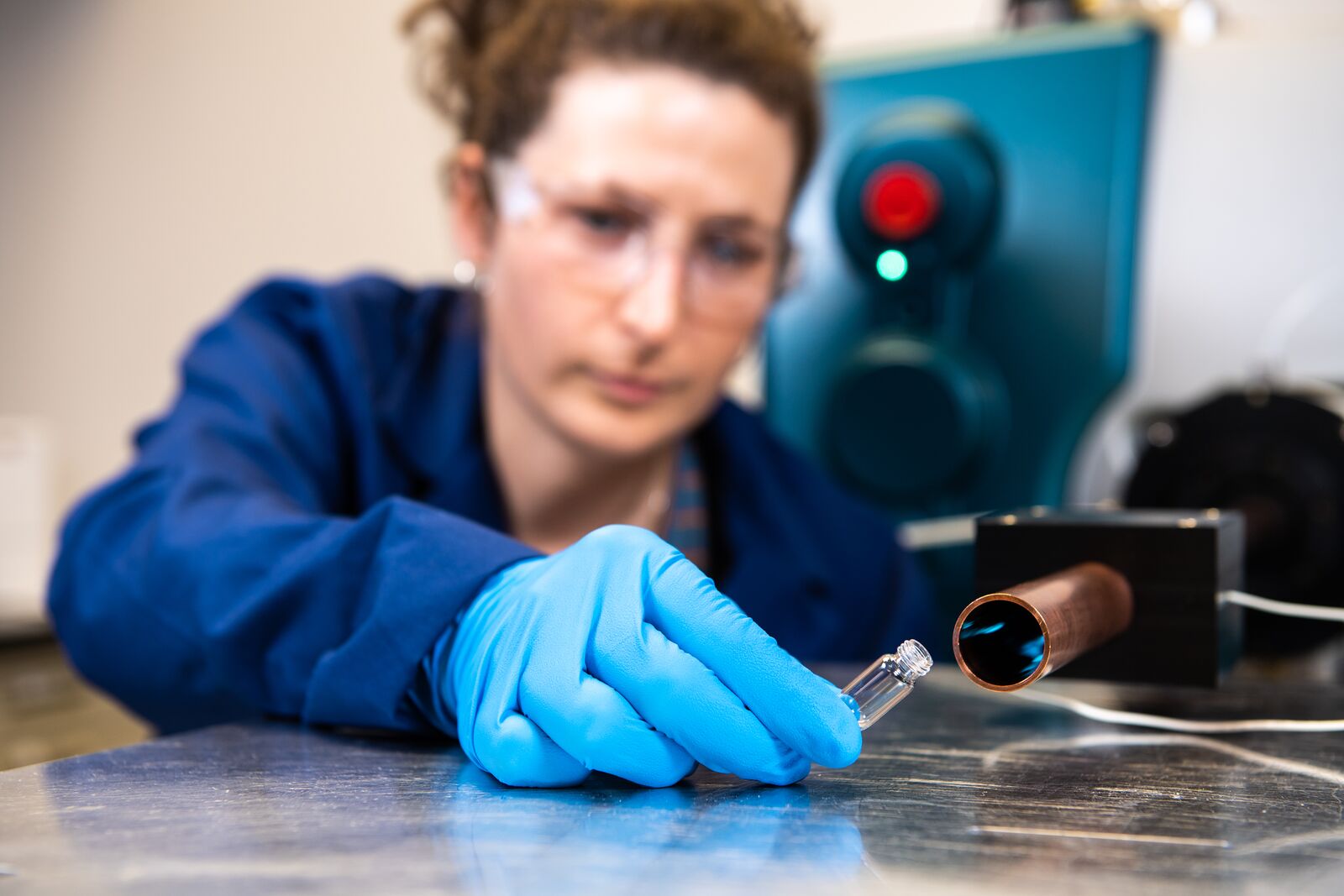 A scientist wearing protective clothing and eyewear holds a small glass tube at the entrance of a metal tube, collecting vapor.