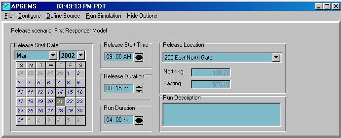 The APGEMS main menu is provided at the top of the APGEMS display. The main menu is used to set the date and time of the beginning of the release, the release duration, he simulation duration, and the location of the release before running the model. Additional information can be set using the Options menu. When all parameters are set to the use's satisfaction, the Run button is clicked and the model simulation will begin. A several hour simulation usually takes a few seconds to run on a standard PC. Once the simulation is completed, the model will automatically generate and display initial output graphics.